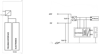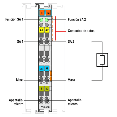 - Tensión de alimentación (campo): 24 VCC (-25 … +30 %); a través de contactos de potencia (fuente de alimentación a través de conexión CAGE CLAMP®; transmisión a través de contacto elástico)